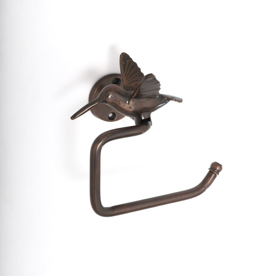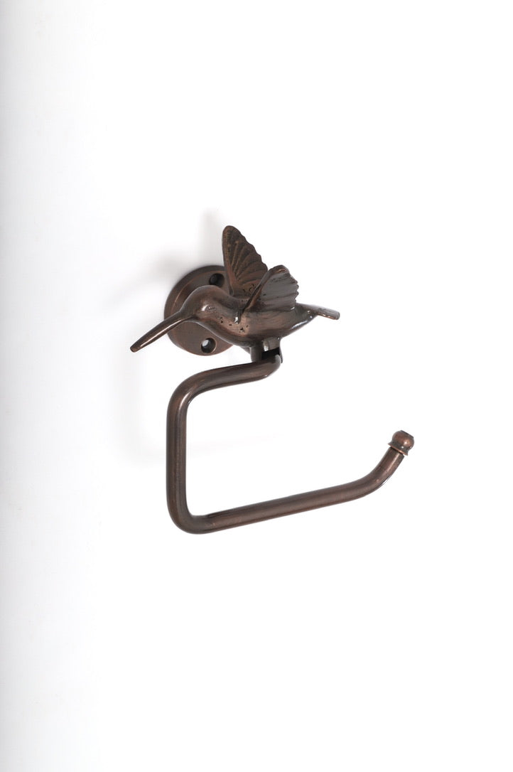 Portarrollo fabricado en bronce macizo, con una linda figura de colibrí en la parte superior. Un detalle divertido y original que convierte cualquier baño en un espacio más especial y lleno de personalidad.