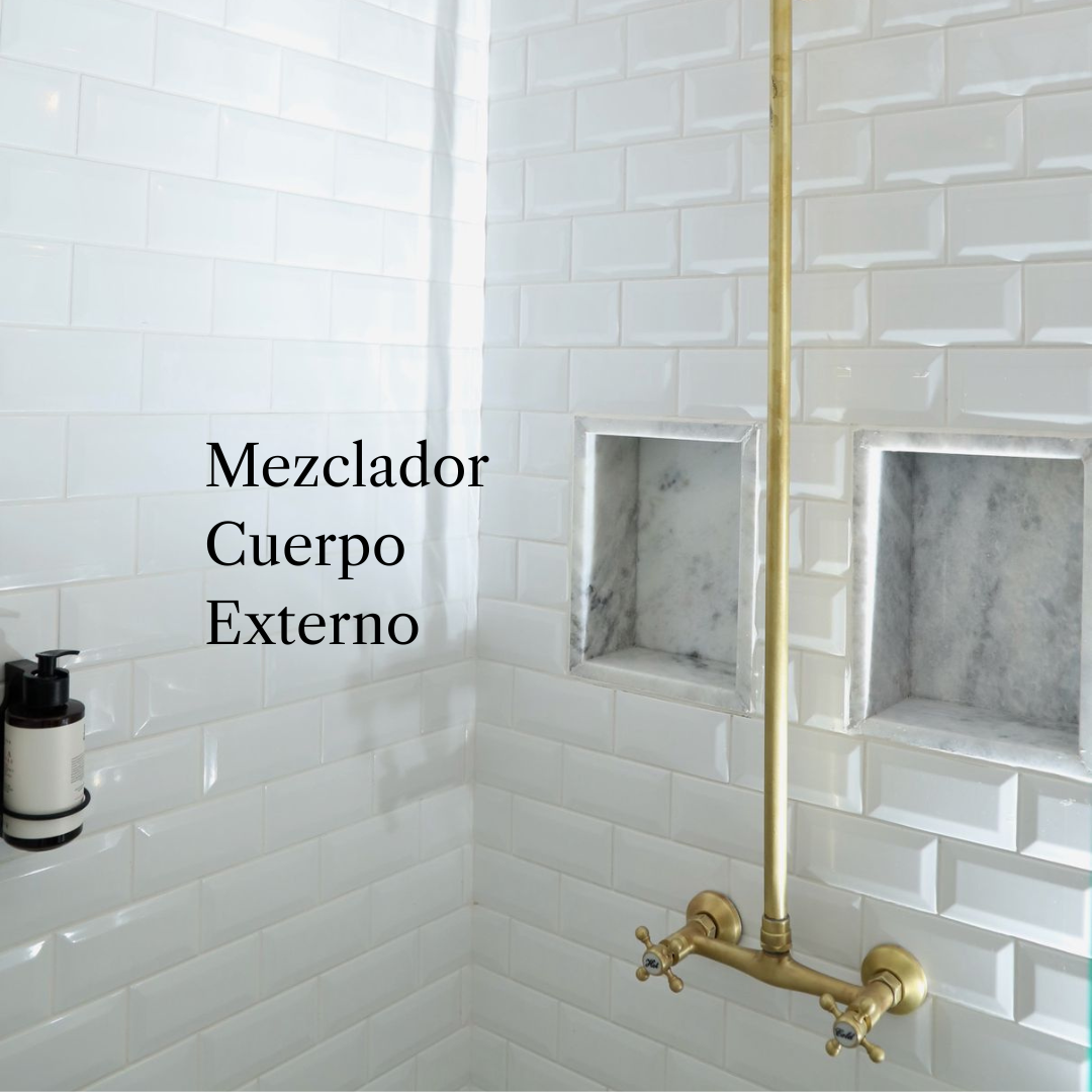 • Cuerpo externo visible: tanto el mezclador como la tubería de la ducha quedan expuestos sobre la pared. Este sistema puede incluir salida para teleducha o lavapiés, incorporando un diverter que permite seleccionar fácilmente la salida de agua deseada.